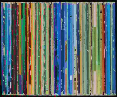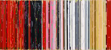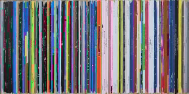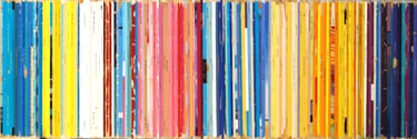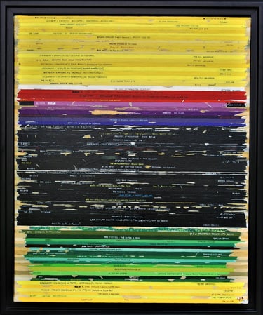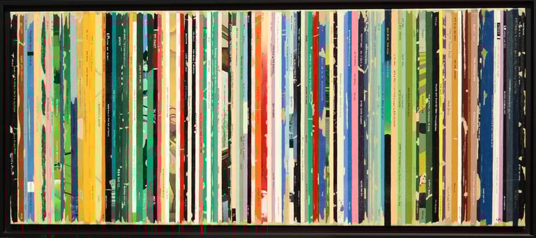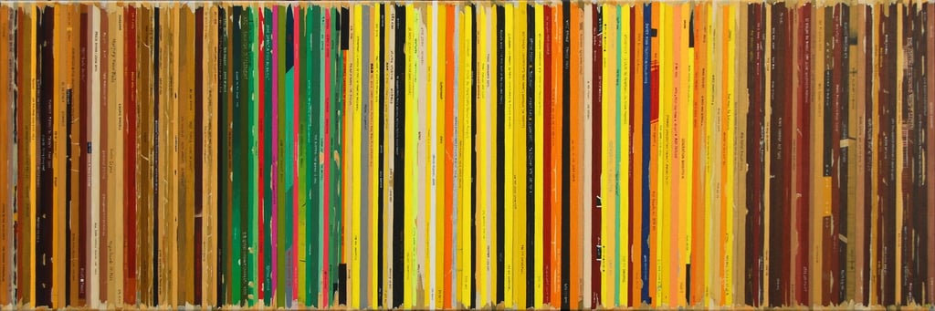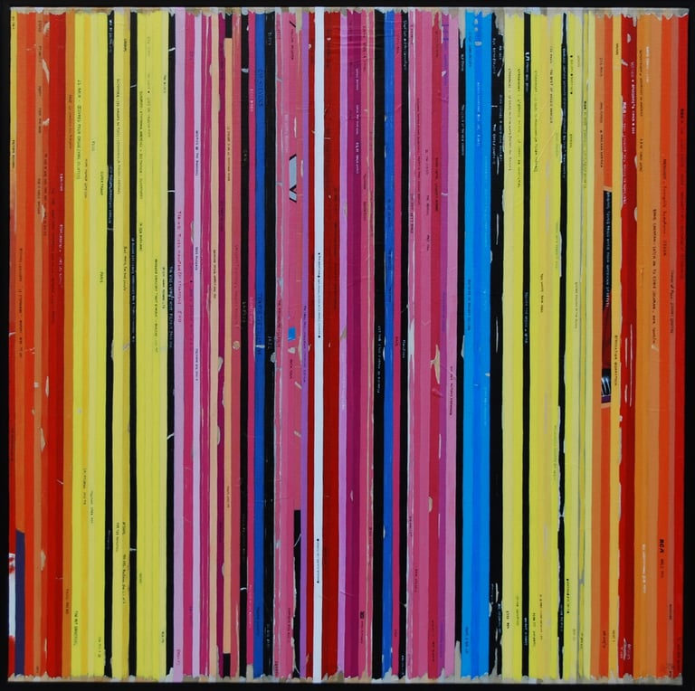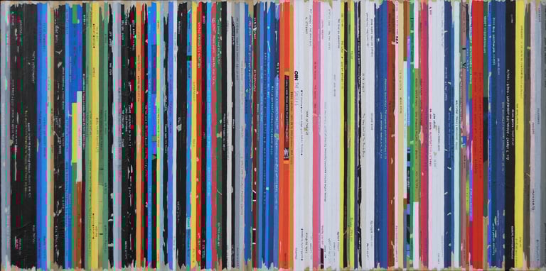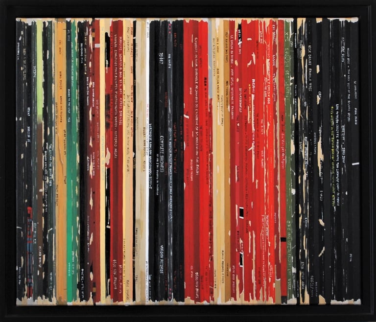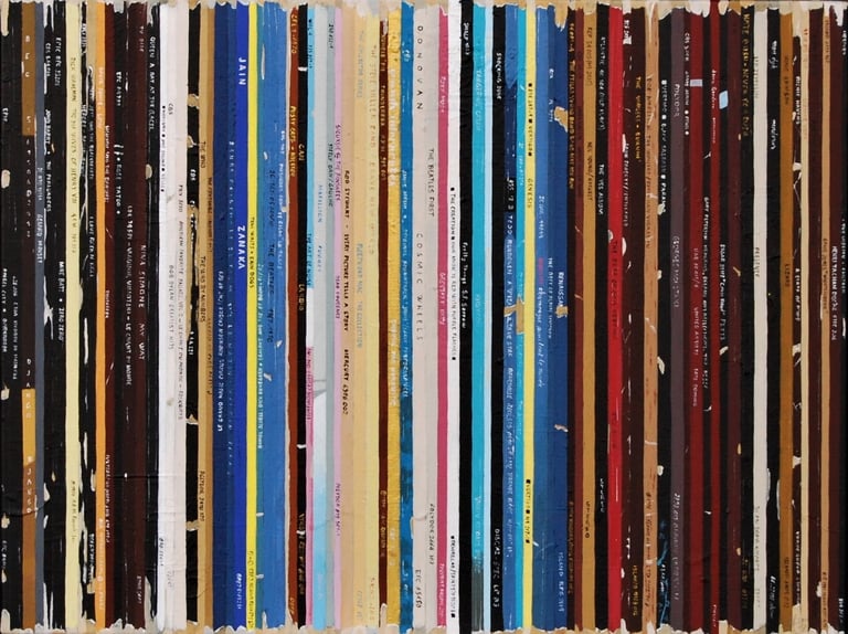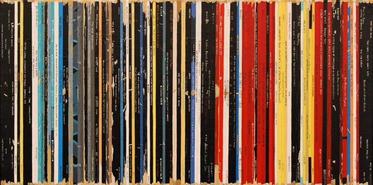 La série Bandes Son est un ensemble de peintures constituées de tranches de pochettes de disques vinyles, ou plutot de reproductions de tranches peintes à l'acrylique.