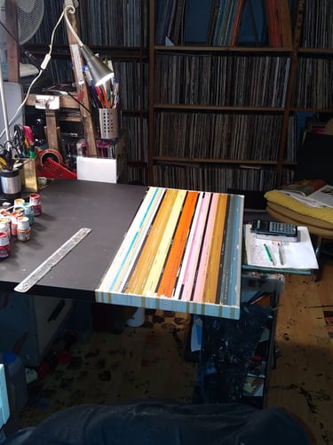 Puis, ayant fait le tour, il a décidé, comme dans une spirale, de peindre la peinture, c'est à dire de remixer des oeuvres de grands artistes avec ses tranches de pochettes, de jouer avec les couleurs et de proposer une nouvelle lecture de ces oeuvres. Et tout ça en écoutant chaque disque utilisé pour son tableau (la collection de disques étant aussi centrale que la peinture).