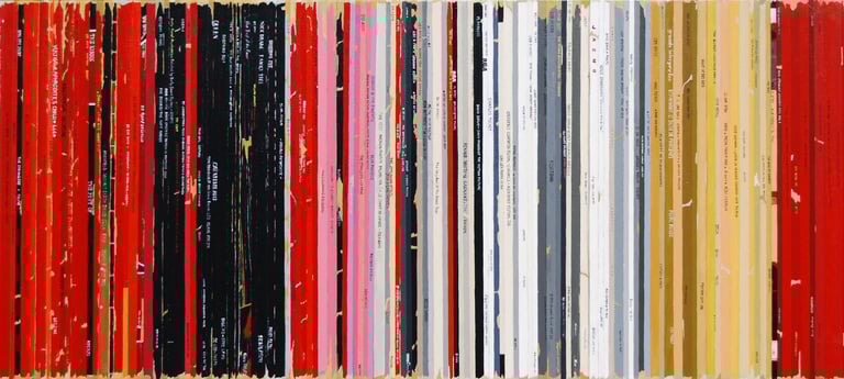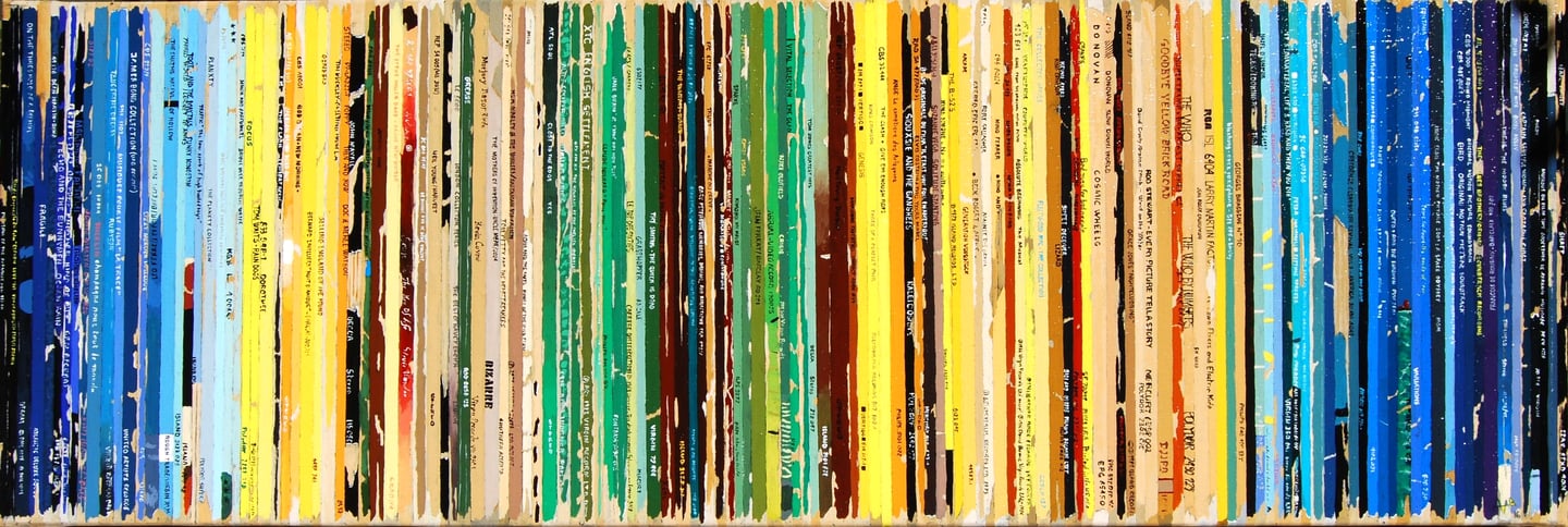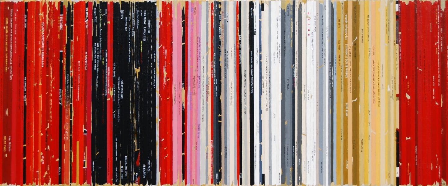 La série Bandes Son est un ensemble de peintures constituées de tranches de pochettes de disques vinyles, ou plutot de reproductions de tranches peintes à l'acrylique.