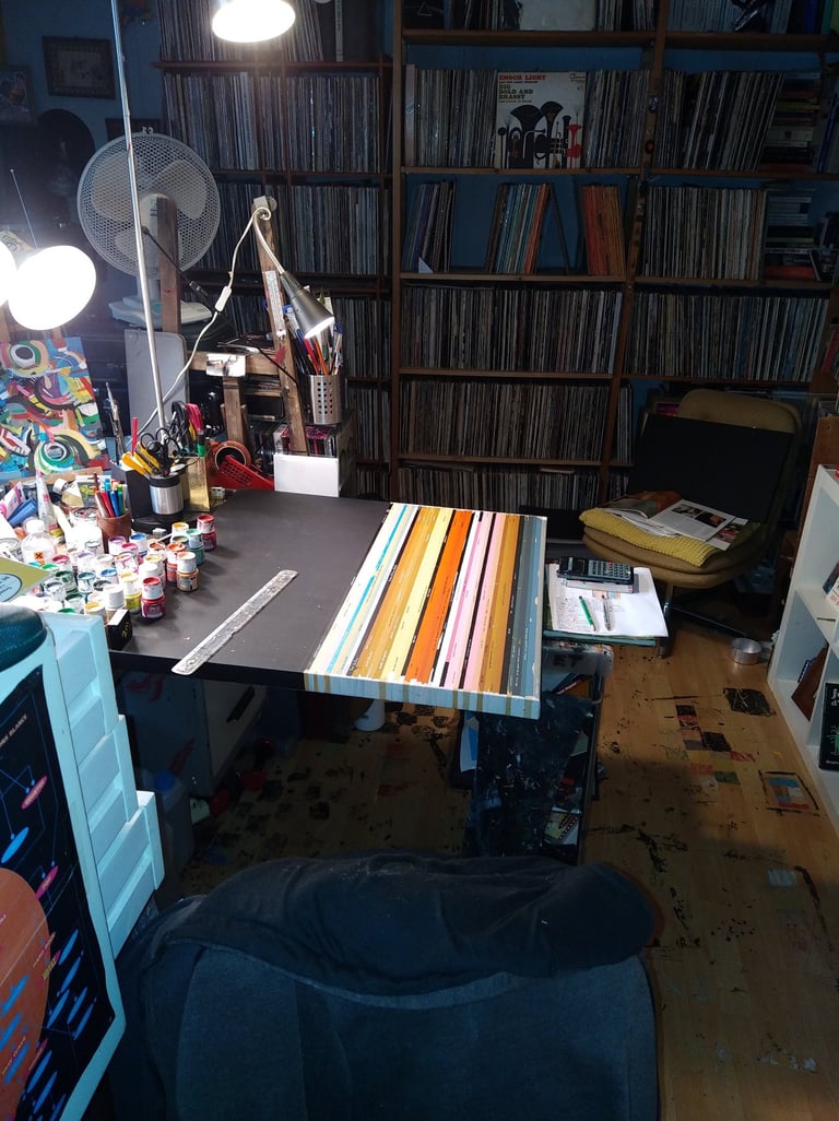 Puis, ayant fait le tour, il a décidé, comme dans une spirale, de peindre la peinture, c'est à dire de remixer des oeuvres de grands artistes avec ses tranches de pochettes, de jouer avec les couleurs et de proposer une nouvelle lecture de ces oeuvres. Et tout ça en écoutant chaque disque utilisé pour son tableau (la collection de disques étant aussi centrale que la peinture).